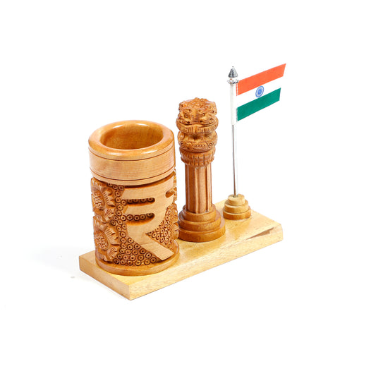 Wooden Ashoka Pillar Pen Holder with National Flag – Desk Organizer for Office & Home